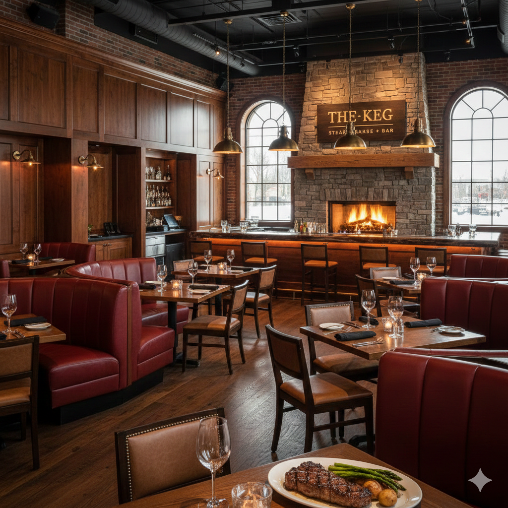 The interior of The Keg in Pointe Claire reflects the restaurant’s signature style: warm, inviting, and modern with a classic steakhouse feel. The space combines wooden textures, low lighting, leather seating, and stylish décor that creates a comfortable environment for families, couples, and business diners.