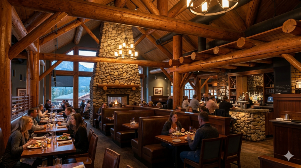 The interior design of this restaurant reflects the natural beauty of Banff. It features warm lighting, wooden textures, and comfortable seating that creates a cozy and inviting environment. The dining area is spacious, with a mix of booth seating and tables for small and large groups.